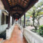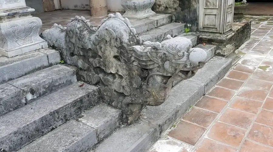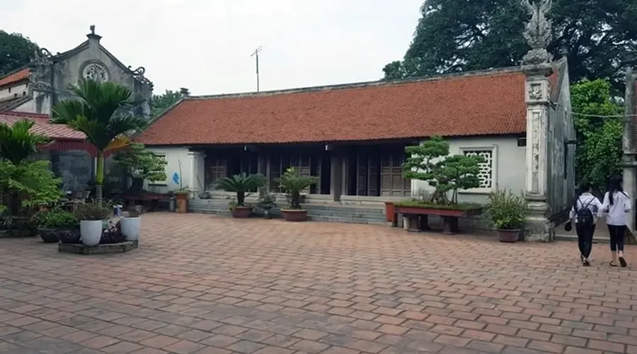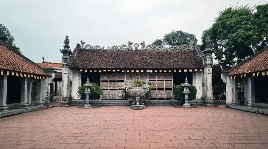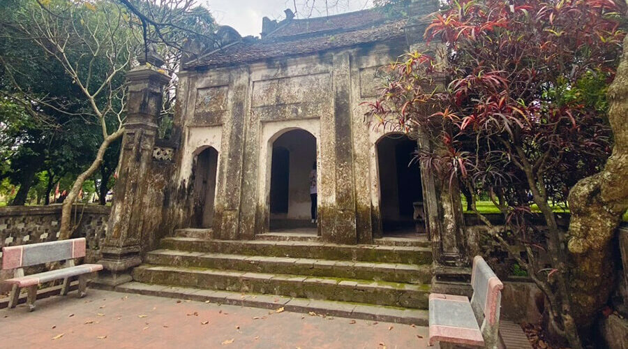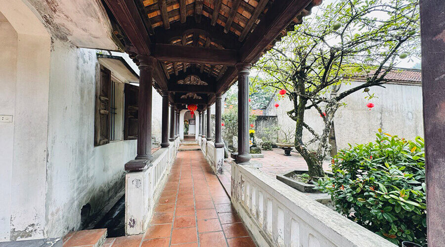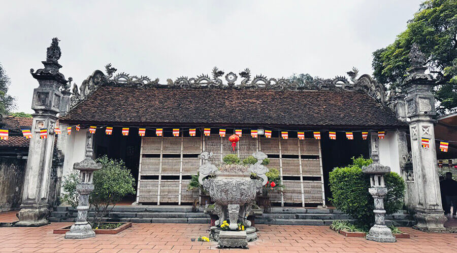 The pagoda faces south to the Day River. The outermost part, adjacent to the road and near the river bank, is the three-door gate of the pagoda. This structure has a raised foundation, built five steps higher and two ends are covered with gables.