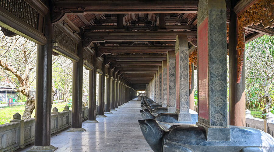Phap Chu hall has 5 compartments, the middle compartment worships the bronze Buddha, 10m high and weighing 100 tons. The hall also preserves 3 horizontal lacquered boards and 3 largest arched doors in Vietnam.