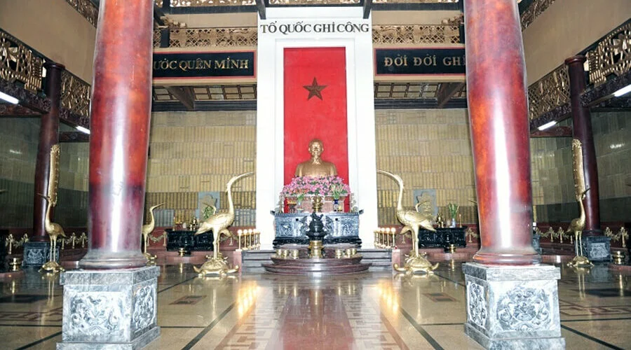 The architecture looks like an ancient temple of Vietnam, both sacred and quiet. The shrine is arranged in a U shape: the center is the altar of the fatherland, in the middle is a statue of President Ho Chi Minh, above it is written: For the country forgets ourself – Fatherland attribution – Eternally remember.