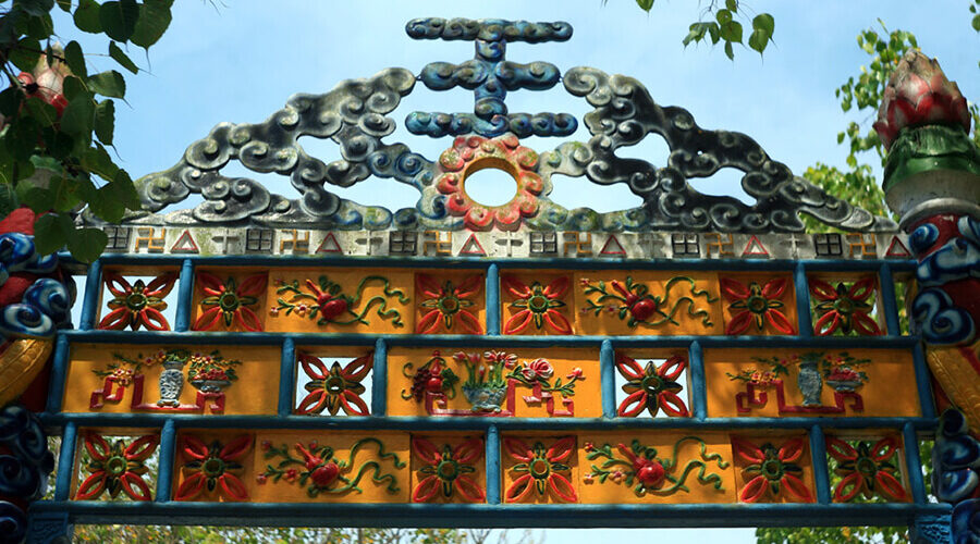 The three-door gate and bell tower of Nam Quoc Phat Pagoda – the ancient name of the Coconut Religion relic complex. This three-door gate is modeled after the three-door gate architecture in the Hue Imperial City.