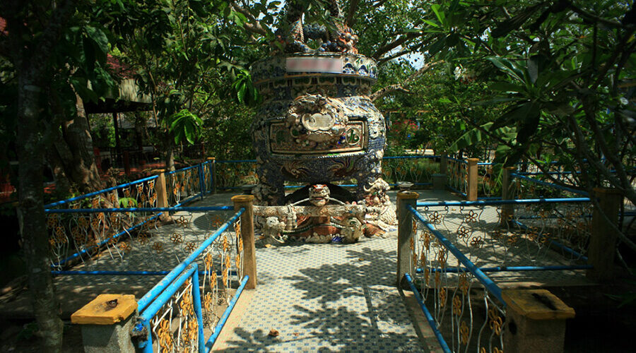 Next to the three-door gate is a large burning cauldron. The cauldron is cast in reinforced concrete, with elaborate ceramic inlays on the surface. A marble slab with the name of Nguyen Thanh Nam is mounted on the top. Another slab briefly records the background of Mr. Nam and those who helped him build the place of practice.