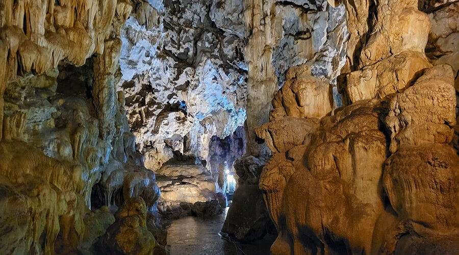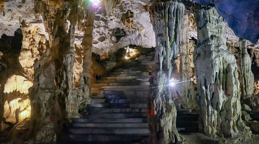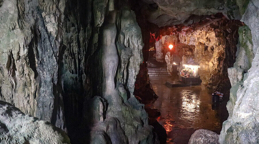 The dark cave is longer and wider. The stalactites in this cave form many vivid images placed by the locals such as: elephants drinking water from a jar, tigers drinking water from a jar, monkeys carrying their children, old women selling medicine, money trees, gold trees, silver trees, rice trees, etc.