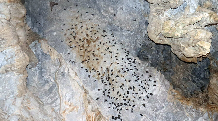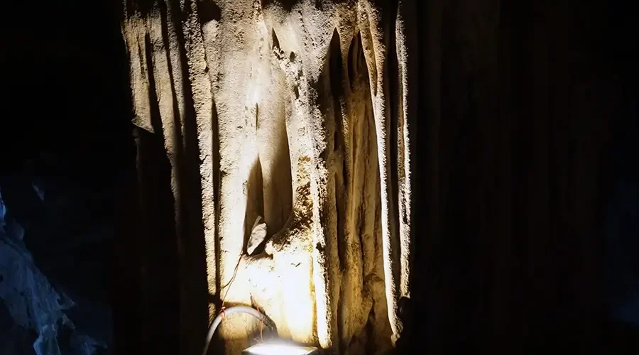 The stalactites in the cave are still sparkling, their colors changing with the sunlight. When using a stone to lightly tap on the stalactites, it makes a sound like a bell. Inside the cave, there are hundreds of bats living on the stone arches.