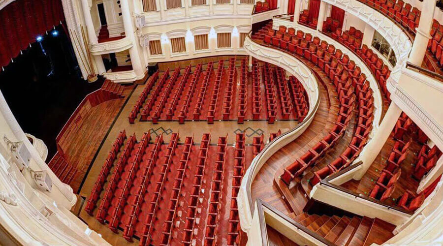 The auditorium has an area of 24 x 24 m including a large stage, 3 tiers of seats with 598 seats in the classic French style of the 19th century. Located in the highest space, the auditorium is intricately designed. With Corinthian columns supporting a colorful frescoed dome. With embossed motifs and a magnificent gold-plated crystal chandelier.