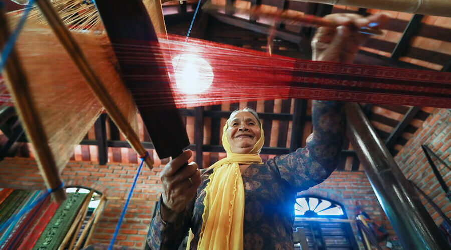 In the cool space of the traditional craft village, people will be able to witness with their own eyes the strange weaving looms of the Champa people worked hard by highly skilled artisans. To weave the pattern, the workers create hanging stones. When they pull the stones up and down according to the correct rules, they can get the correct shape of the patterned thread floating or sinking on the fabric.