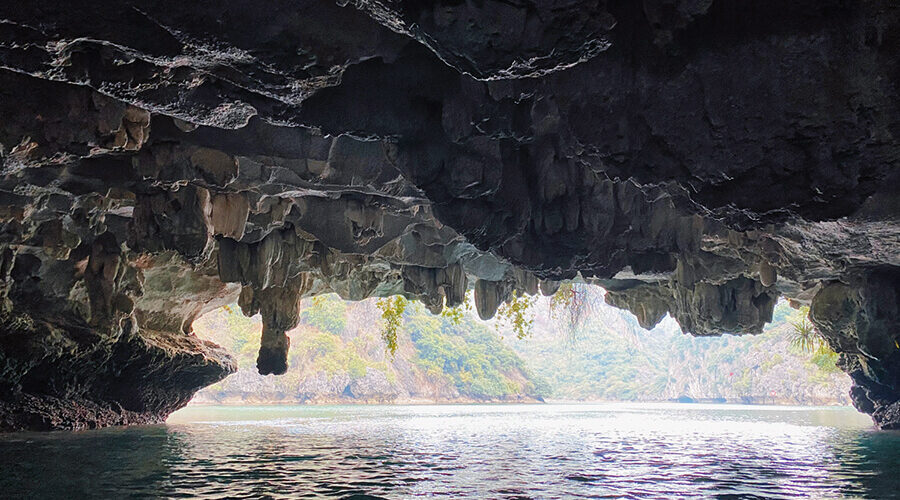 Luon Cave is located in the middle of a group of closed islands in the bay, leading to the sea through a cave entrance about 4 m wide, 3 m high, 100 m long. The brackish water lake in the cave is surrounded by four mountains, about 1 km² wide. On the cliffs there are still fossilized freshwater snail shells.