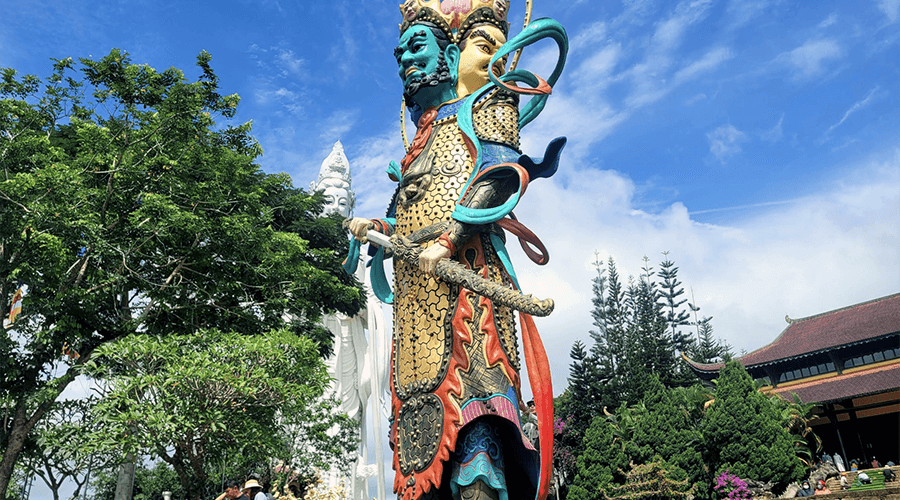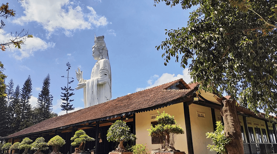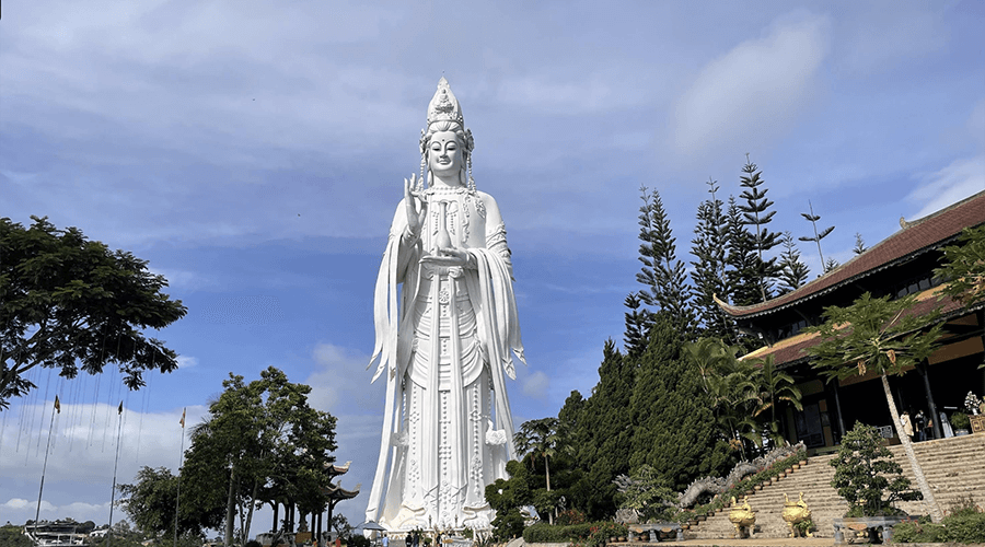 While visiting the pagoda, you will have the opportunity to see two iconic landmarks of Lam Dong province located within the pagoda grounds: the Maitreya Buddha statue, over 12.5 meters high and over 6.5 meters wide (sometimes reaching 9 meters in width), and the Avalokiteśvara Buddha statue, over 70 meters high. These are the two largest and most prominent structures in Lam Dong province to date.