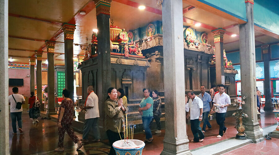 The main shrine is where people offer prayers and worship. It is dedicated to the goddess Mariamman – a popular folk deity in South India, especially among the Tamil community. Beside the goddess are two guardian deities: Maduraiveeran (on the left) and Pechiamman (on the right).
