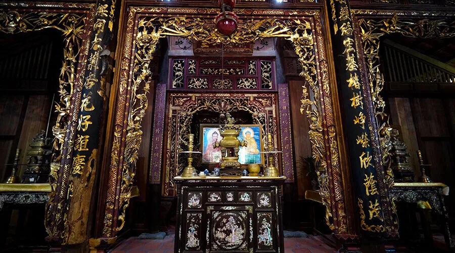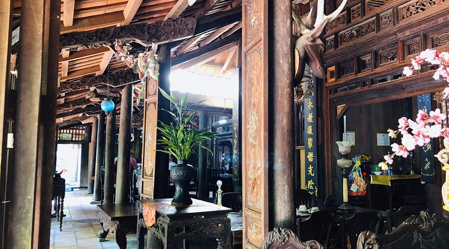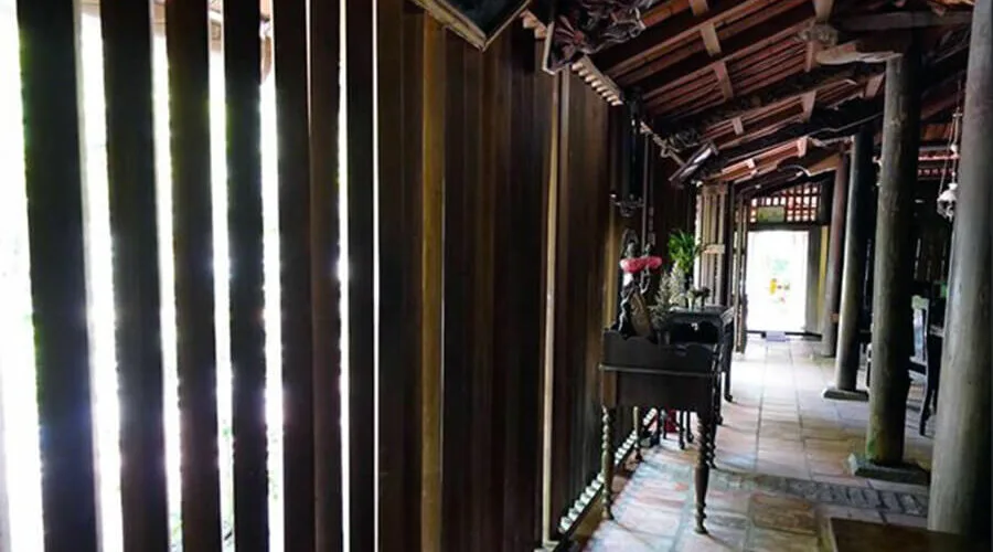 The carved and decorative patterns on the rafters, columns, skewers, and walls are very elaborate, typical of the style of ancient houses in the Mekong Delta region. The roof is covered with yin-and-yang tiles, one row facing up, one row facing up alternately. The column truss is designed in a typical overlapping beam style.