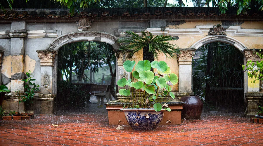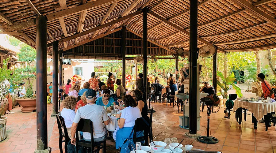Mr. Kiet’s ancient house is nestled in the middle of a green orchard. In front of the house is a large yard with stone tables, chairs, and swinging hammocks under the shade of trees.