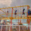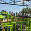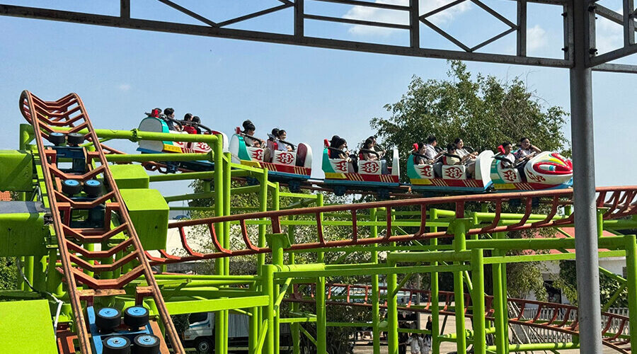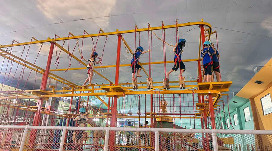 Indoor game area with attractions such as trampolines, ziplines, and bumper cars, and outdoor game area with flying carpets, roller coasters, and Ferris wheels.