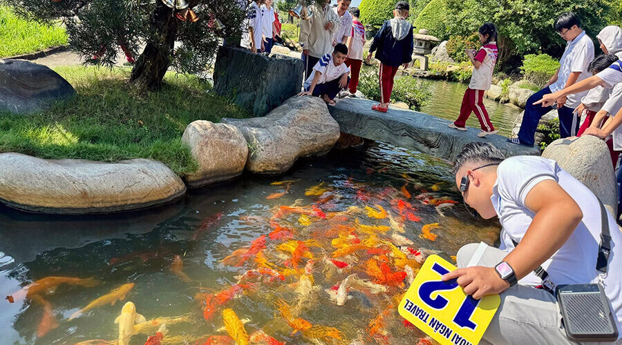 This area is likened to a miniature Japan, with meticulously planted and pruned bonsai trees, a lush green space, and a winding canal home to schools of koi swimming freely. In the middle of the lake, striking red bridges allow visitors to cross and take photos against the natural backdrop.