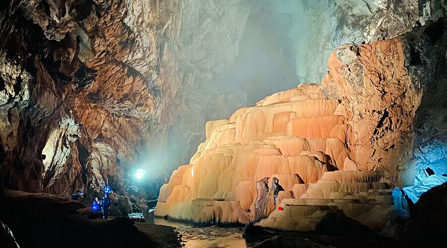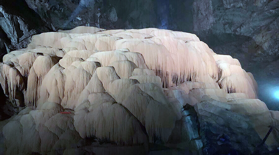 In the cave there are many chambers, floors, stairs, corridors of all sizes; many stalactites, stalagmites, columns, stone borders… of all shapes, associated with coral trees, ships, golden falls, silver falls, upside-down lotuses, lonely stone pillars, terraced fields. All are created by nature with a magnificent and magical landscape that is “one of a kind.”