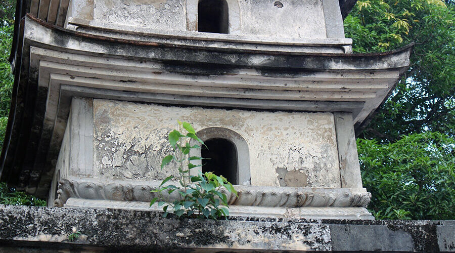 The body of the tower has 14 floors, the floors of the tower have a common appearance, but some details are different. The first leval is built entirely of green stone, from the second level up are built with bricks, plastered tightly. Each end of the brick has an inscription and depicts a dragon in relief from the Tran Dynasty.