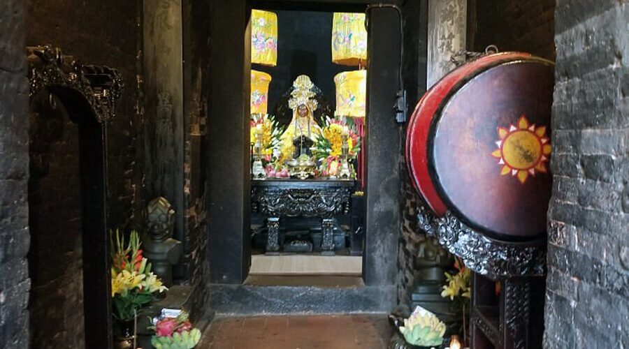 The middle level is called Mandapa (meaning “guesthouse” or “meditation house”) for pilgrims to rest and prepare offerings. The Mandapa is 20 meters long and 15 meters wide, with four rows of octagonal columns (10 large and 12 smaller). The large columns have mortise-and-tenon joints, deeply carved into the shafts and symmetrically aligned with the tops of the smaller columns.