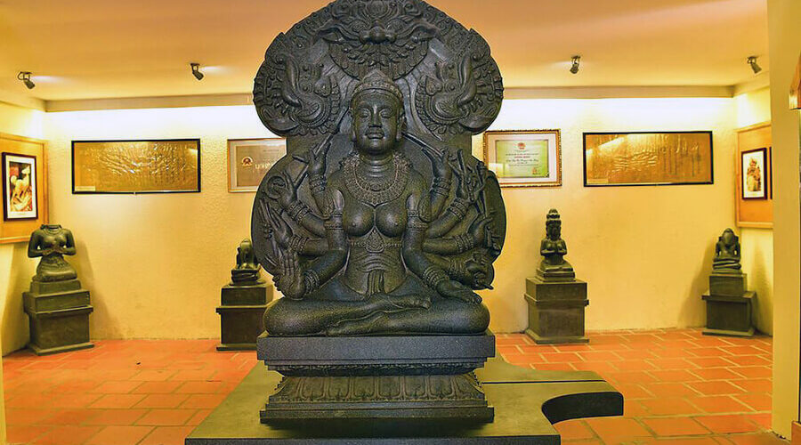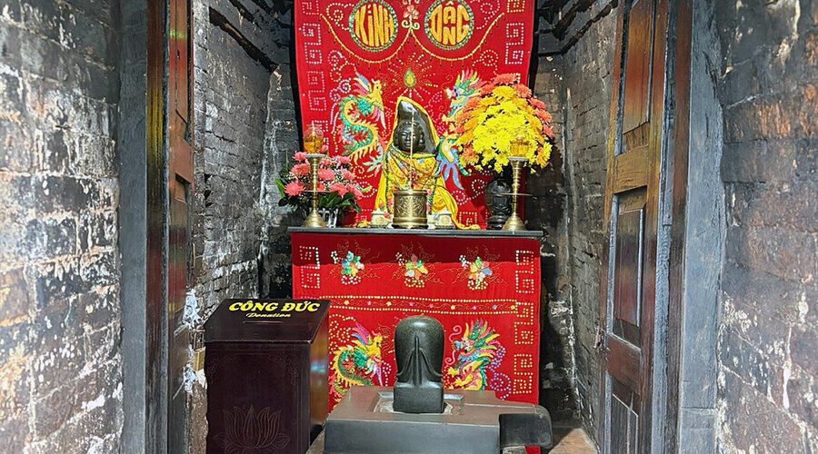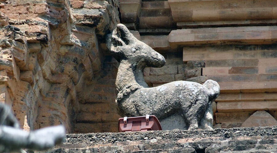 The tower has four levels, each with doors, statues of gods, and stone animal figures. Inside is a statue of a goddess (2.6 meters high), carved from black granite (previously made of sandalwood, and even further back, gold), seated on a majestic lotus-shaped stone pedestal, her back resting against a large Bodhi-leaf-shaped stone slab. This is a masterpiece of Cham sculpture, a harmonious combination of round and relief carving techniques. At the top of the tower is a statue of the god Shiva riding the bull Nandin, along with other sacred animal statues.