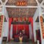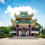 The three-entrance gate is built in the style of a double-roofed boat (two overlapping roofs in the shape of a boat), covered with dark red yin-yang tiles imitating antiquity. On the gate are elaborate patterns and reliefs; the large, sturdy red-painted pillars create a majestic entrance.