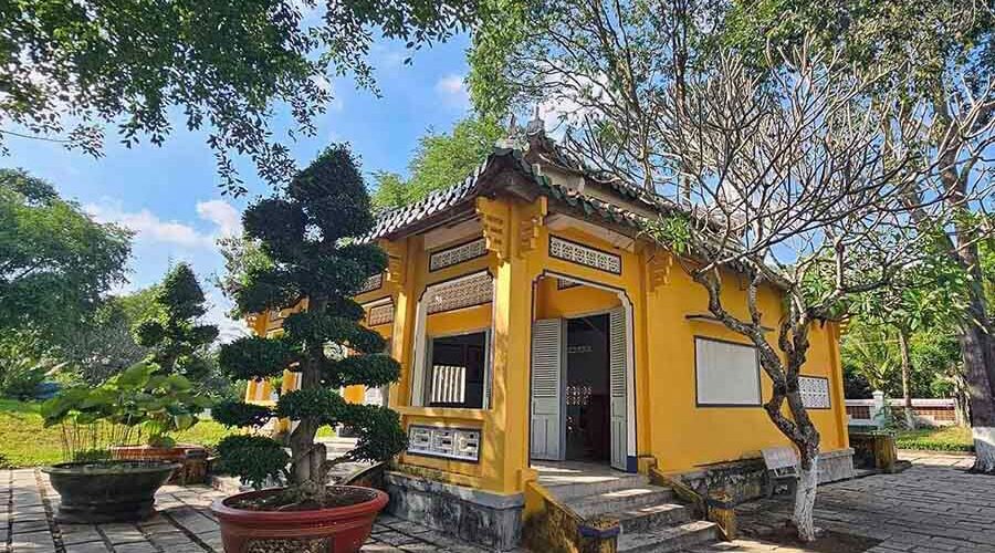 The couplets is carved, expressing the poet’s spirit and humanitarian ideology. Behind the main hall is a tomb area on a high ground, including the tombs of Nguyen Dinh Chieu, his wife Le Thi Dien, and the tomb of poetess Suong Nguyet Anh located separately next to it.