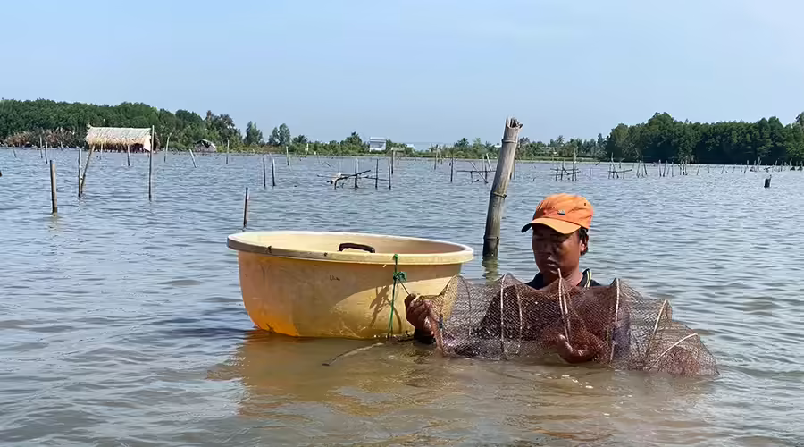They use the water surface area to raise giant tiger prawns and Ca Mau crabs. These are two types of seafood with high economic value, firmly established in the list of Vietnamese specialties.
