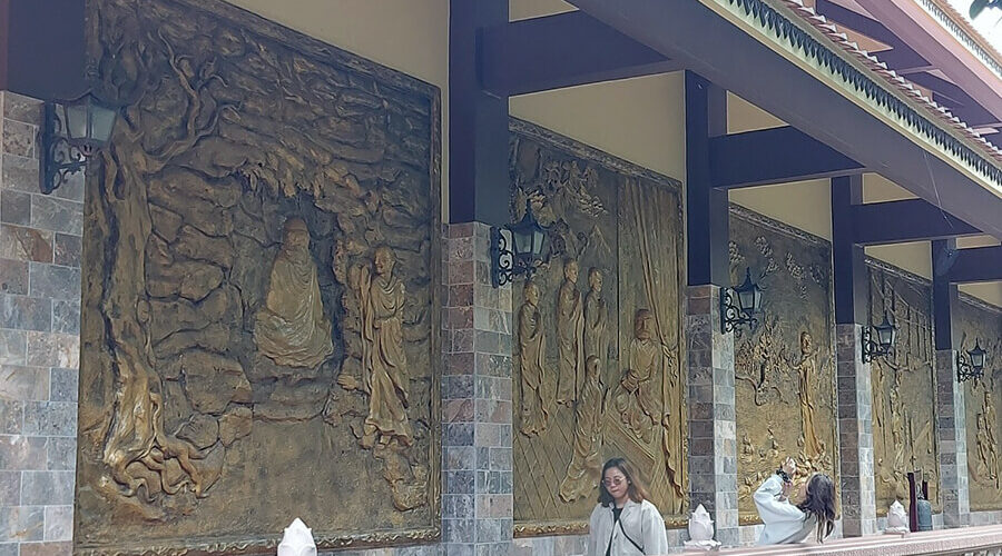The bell tower, built to the right of the main ceremonial hall, is exquisitely carved and houses a large bronze bell weighing approximately 1.1 tons, captivating visitors with its delicate carvings. Beside it is a bas-relief with profound Buddhist significance.