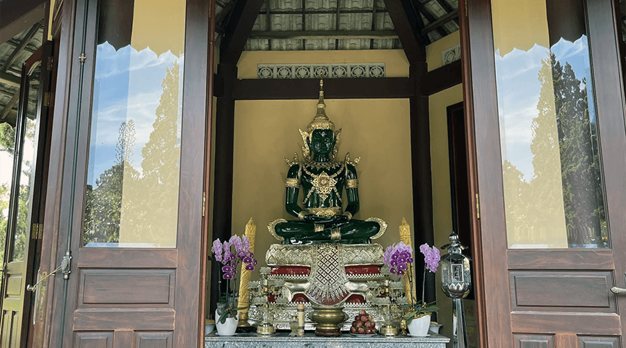 The temple is located on a 24-hectare plot of land. Of the 24 hectares, 2 hectares are occupied by buildings, divided into two areas: domestic and public. The domestic area is closed to the public. There are two domestic quarters, one for monks and one for nuns. Each domestic quarter has two sangha meeting rooms, a meditation hall, a kitchen, a dining room, and a shed.