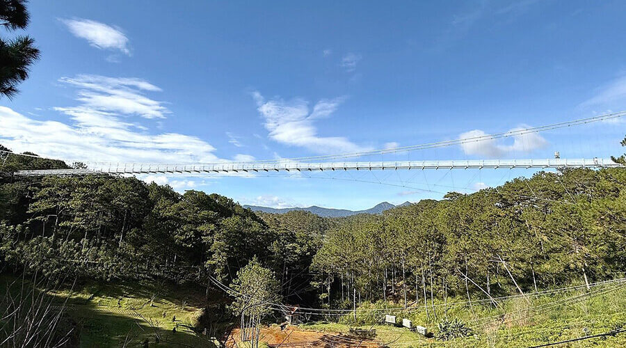 Standing on the bridge, you can admire the entire view of Da Thien Lake, the vast pine hills, and the vibrant flower gardens from a completely new perspective. This is definitely an experience not to be missed for those who love thrills and want to admire the panoramic view of the valley.