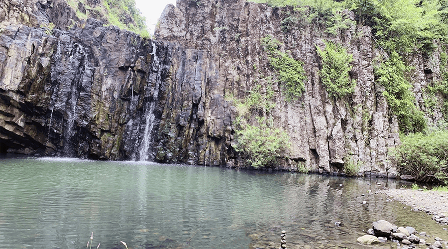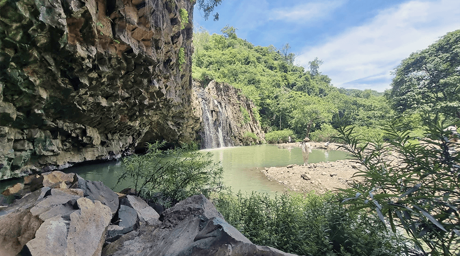 At the foot of the waterfall is a wide, deep natural lake with a distinctive emerald-green hue. The crystal-clear water reflects the surrounding cliffs and forest canopy, creating a tranquil and poetic natural landscape. The area is always cool and fresh thanks to the relatively intact surrounding forest ecosystem, with lush greenery and the harmonious sounds of birds and streams.