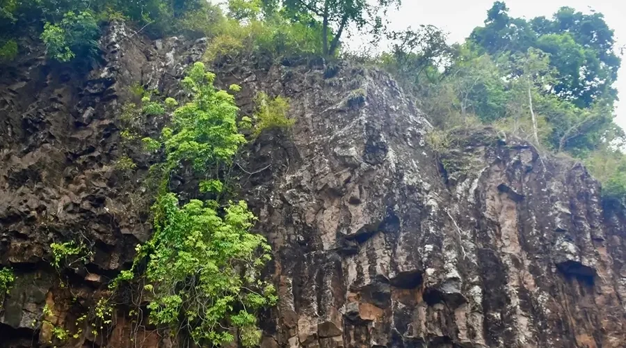 The waterfall is situated between towering basalt cliffs, stacked in columns like a “Da Dia Rapids” but standing vertically in the mountains. These prismatic rock formations create a natural wall surrounding the waterfall, both majestic and mysterious, reflecting millions of years of geological formation. The shape of the deep, enclosed gorge, resembling an “abyss,” is the origin of its name, Vuc Hom (box gorge).