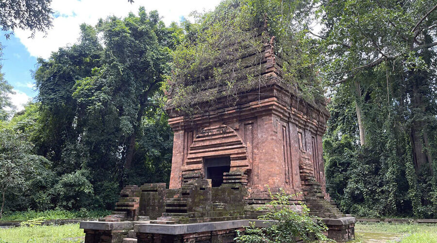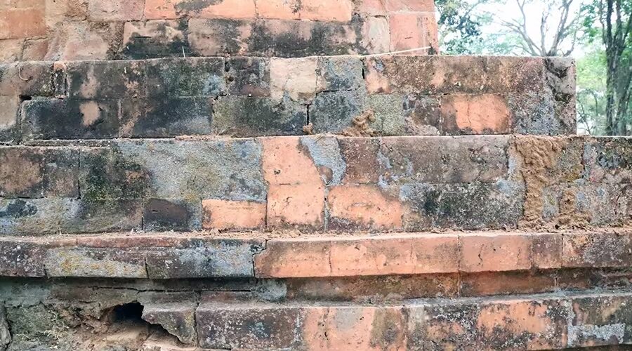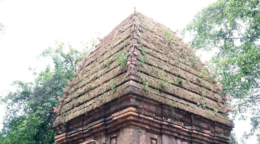 Yang Prong Tower is a structure of red fired bricks on a raised base of blue stone. The tower is still relatively intact, about 10m high, built of hard bricks of various sizes. The tower has a square base, with the eastern vestibule being 1.60m wide. The square structure of the tower has sides of 5m each, with three false doors on each outer wall, and a single door opening to the east, the abode of the deities.